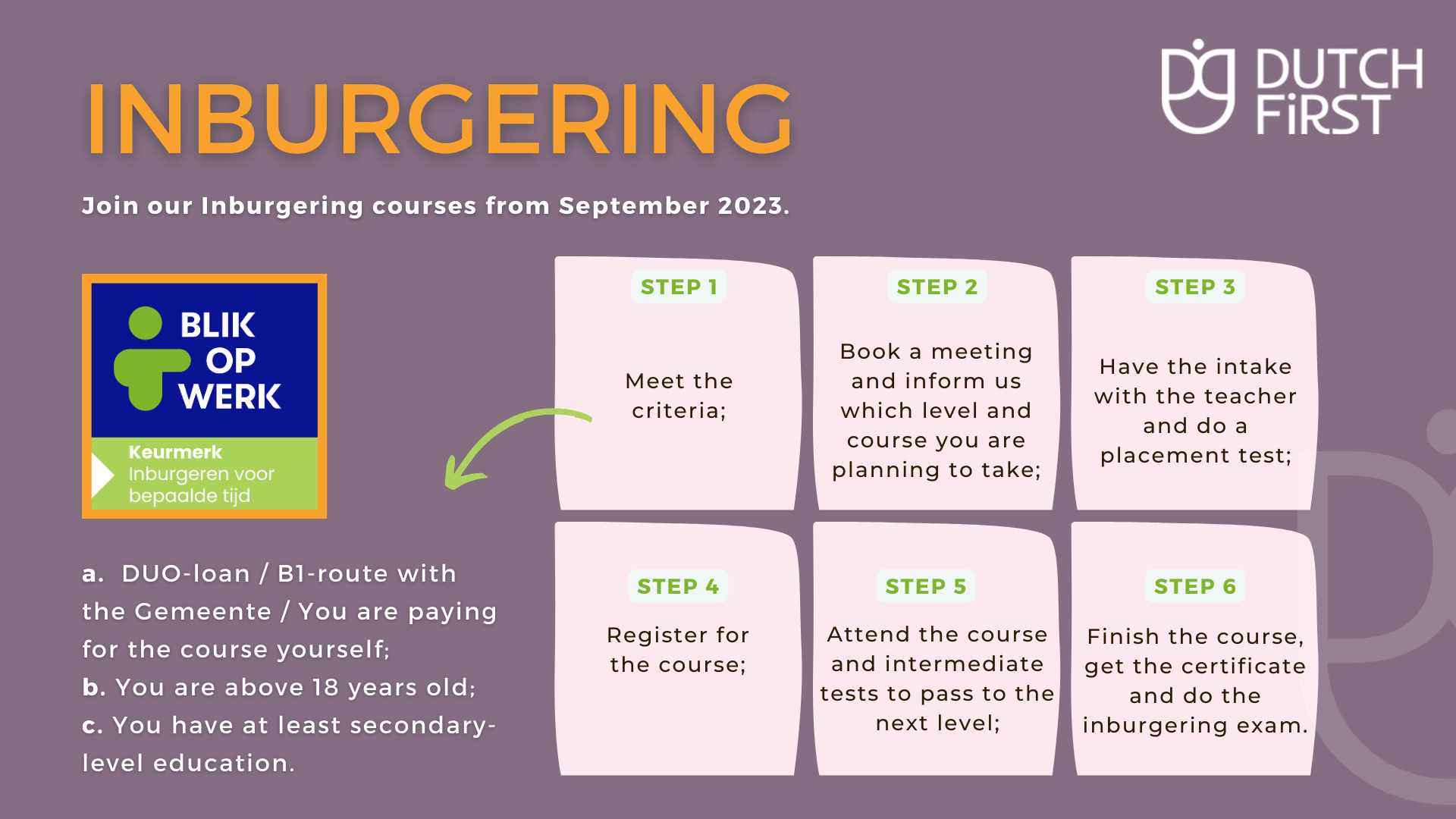 Please contact us in case of more questions about our inburgering courses at info@dutchfirst.nl.